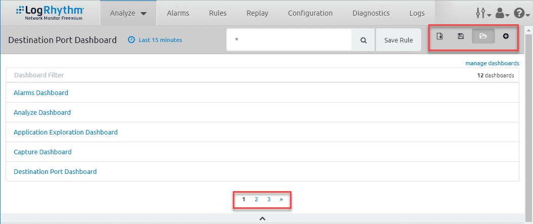 Under the top navigation ribbon, there is a few buttons in the upper-right quadrant that allow opening and saving dashboards. There are quite a few prebuilt dashboards that are installed by default. you can see these by clicking the “open” icon and navigating through the dashboards (in alphabetical order) with the “numbers” menu underneath.