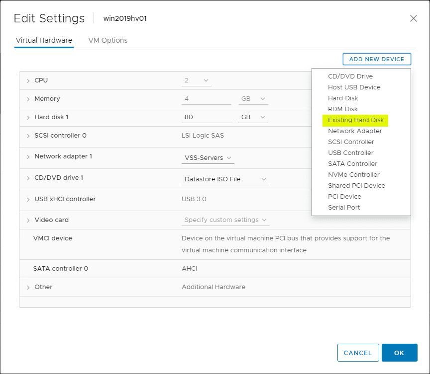 This will create a new multi-writer VMDK to the source VM. Once the VMDK is created, we can add it to another VM. On your target VM that you would like to add the multi-writer VMDK, select to add Existing Hard Disk.