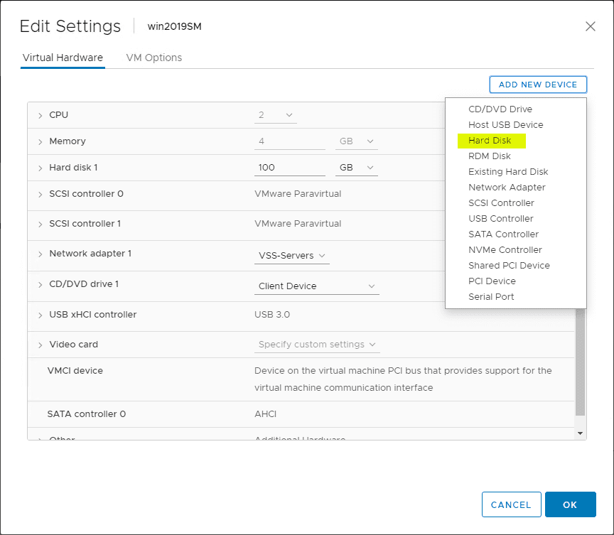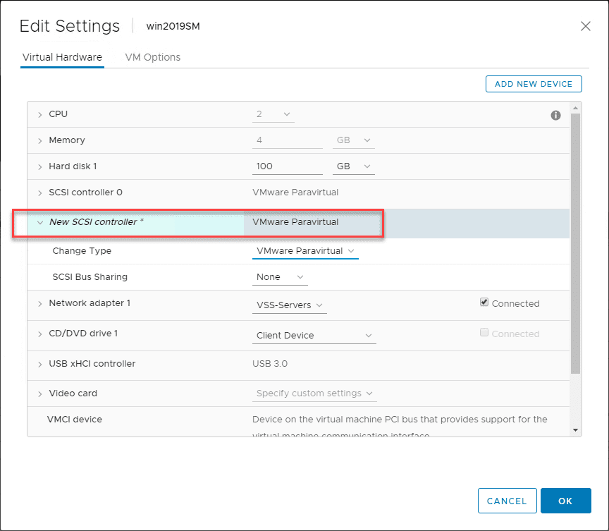 After adding the SCSI Controller, you can see the New SCSI controller listed ready to be added.