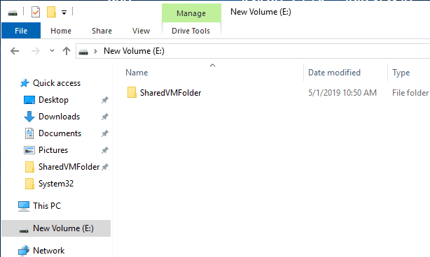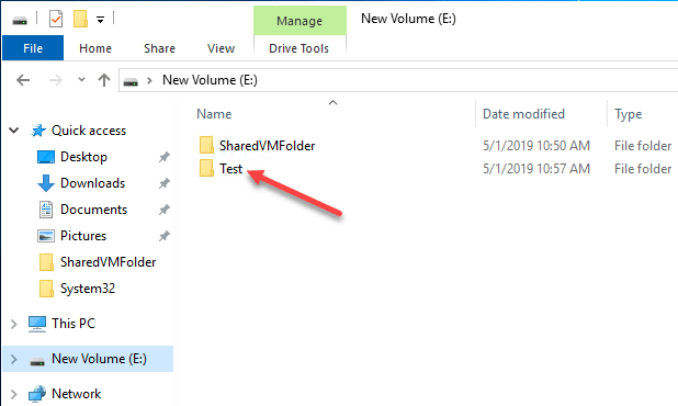 Here, on the source VM, I first created the SharedVMFolder on the new volume. After “onlining” the disk on the second VM, I created the Test folder to show the behavior.