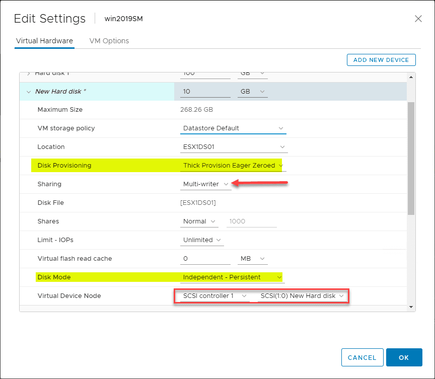 Below, for demonstration purposes, I am adding a small 10 GB drive. Based on the requirements for multi-writer, you must use the following configuration settings: