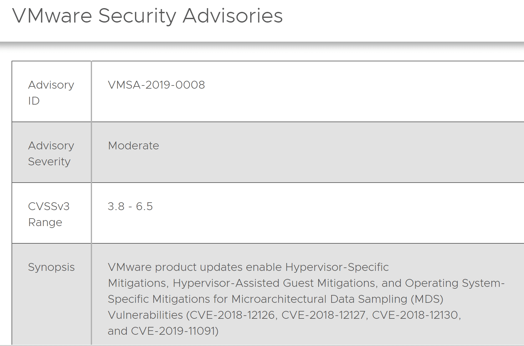 ESXi | 6.0 | Any | CVE-2018-12126 CVE-2018-12127 CVE-2018-12130 CVE-2019-11091 | 6.5 | Moderate | ESXi600-201905401-BG ESXi600-201905402-BG2 | None | KB67577 |