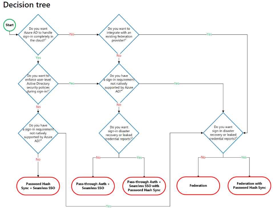 Microsoft has published a decision tree for helping to make the decision on which authentication provider may work best when choosing the right Office 365 authentication option.