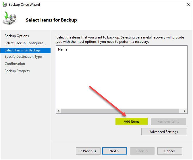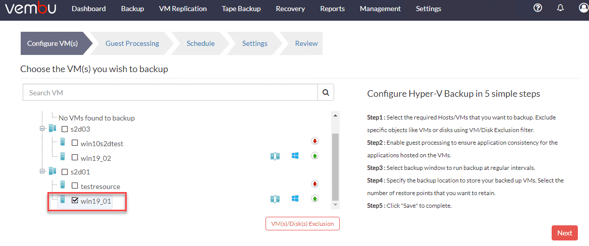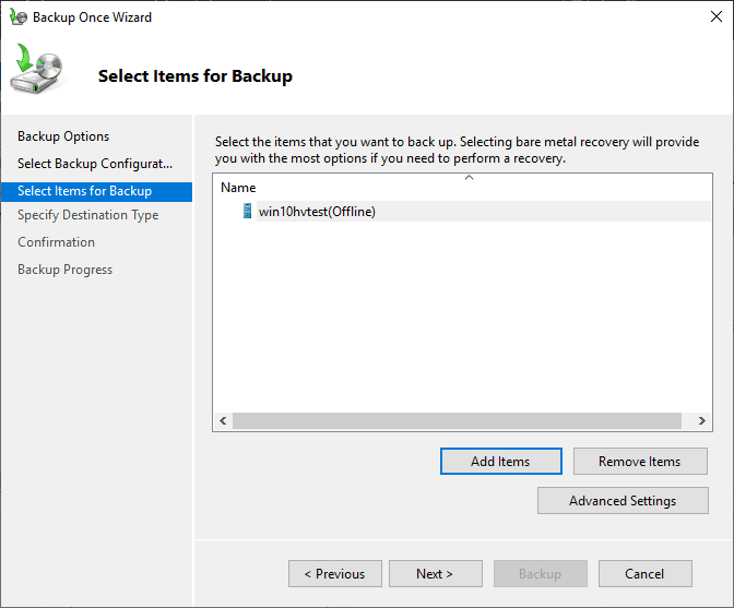 You are returned back to the Select Items for Backup screen. You should now see your Hyper-V VM listed. Click Next.