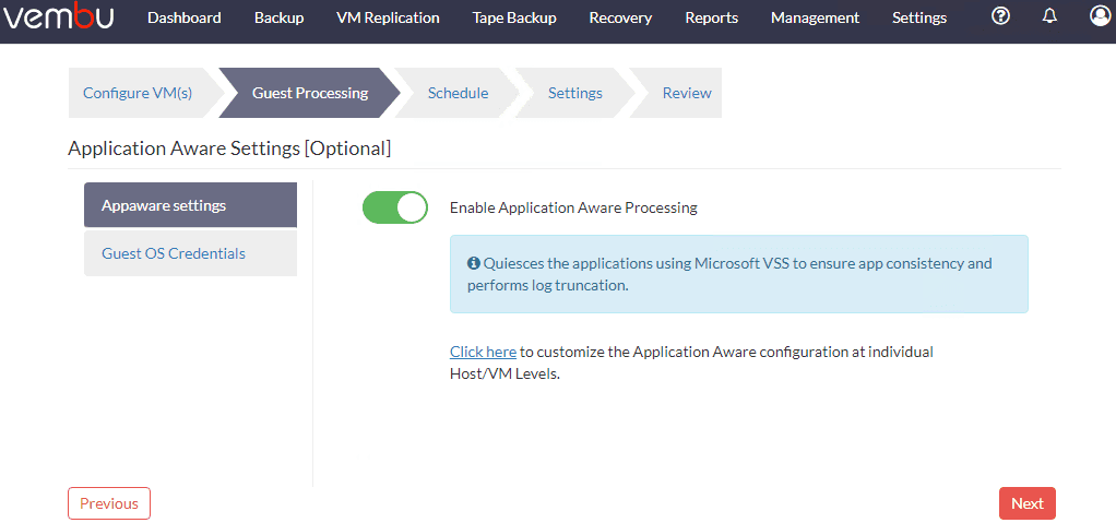 On the Guest Processing screen, you can enable the Application Aware Processing functionality and set credentials for this process.