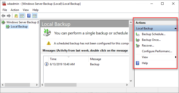 Launch the utility using the wbadmin.msc command which launches the Windows Server Backup management console. You can launch either the Backup Schedule or the Backup Once job wizard to perform scheduled or ad-hoc backups of your Hyper-V server.
