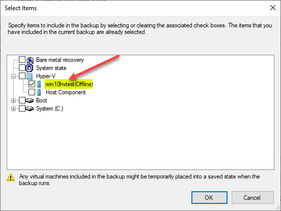Select the specific Hyper-V VMs you want to backup under the Hyper-V node. Since the VM I am testing with is powered off, it is showing as “offline”. Click OK.