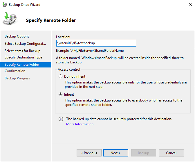 If you choose the remote shared folder, you will be asked to populate the location via a UNC path. I left the Inherit option selected.