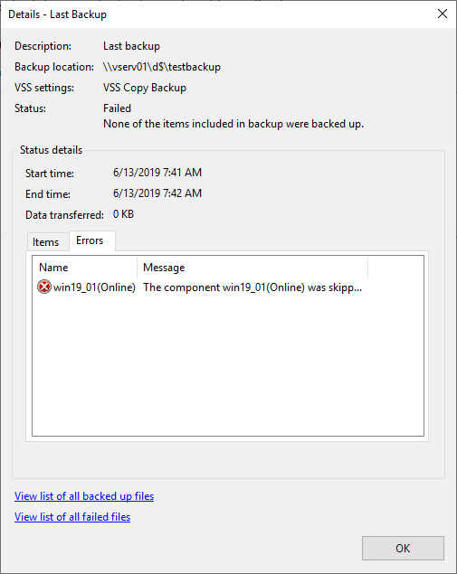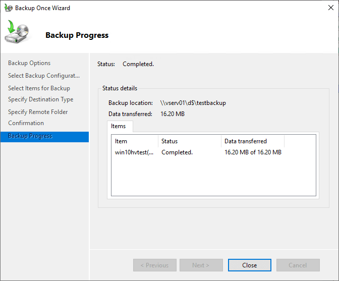 The backup finishes successfully. If you are wondering why the data amount is so minimal, I was testing with a “blank” VM with nothing installed, simply for demonstration purposes.