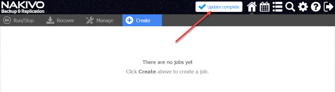 The appliance update should complete successfully. Once it does, when you log back in, you should see the Update complete designation in the upper right-hand corner.