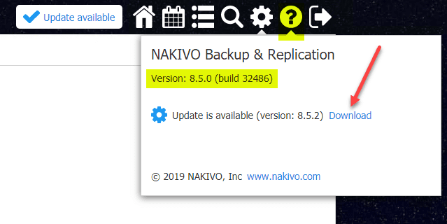The first thing to notice, if you click on the Help button, you will see the note that the Update is available (version: 8.5.2) Download. This is will take you to the traditional update page to manually pull down the updater file from NAKIVO and manually apply it using the traditional steps to upgrade the appliance.