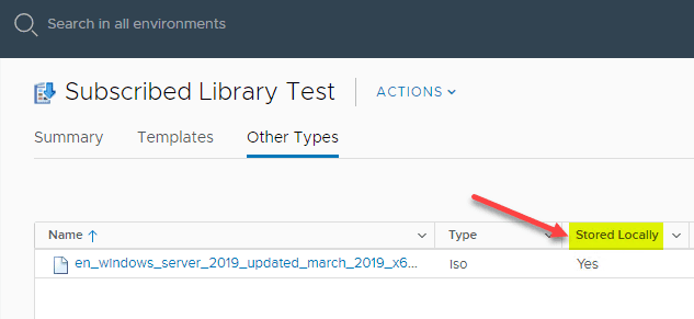 After the Sync Library task finishes, I now see the Stored Locally option showing Yes in the target vCenter Server. This means it has successfully pulled the Content Library items and has them stored locally in storage.