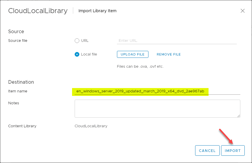 The file to be uploaded is now listed in the Item name. Click the Import button to begin the upload of the file to the Content Library.