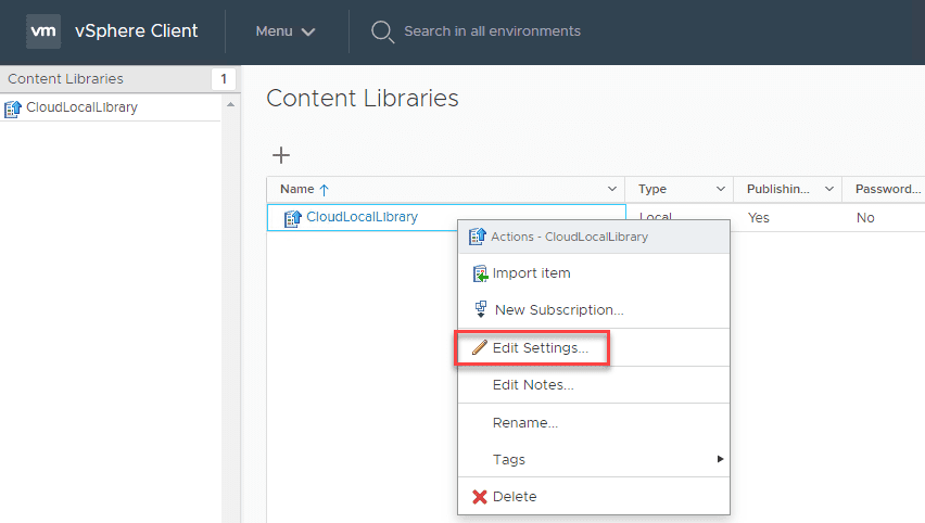 If you want to enable a password on the Content Library for extra security, right click the newly created library in the vSphere Client and select Edit Settings.