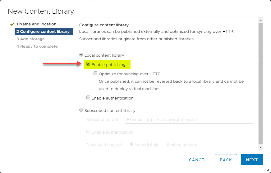 On the Configure content library screen, you Enable publishing. This is what allows publishing the content library via a web interface which allows external vCenter Servers to subscribe. Note the option Optimize for syncing over HTTP. Using this option as detailed by VMware: