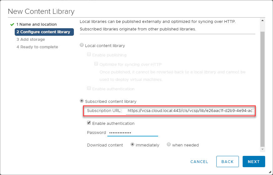 Going back to the New Content Library wizard, on the Configure content library here we select Subscribed content library. In the Subscription URL, enter the URL that you copied from the source vCenter Server with the published Content Library. Also, enter your password if you have one configured for the connection.