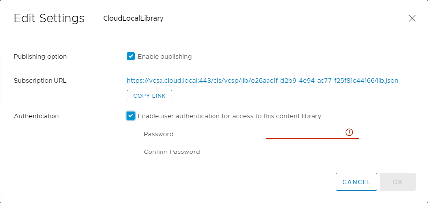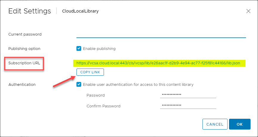 Before moving on to the next screen, go back to your Source Content Library vCenter Server, edit the settings of the Content Library you have published, and you will see the Subscription URL. This is the URL we will need to use for subscribing to the content on the target vCenter Server.
