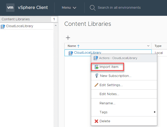 To share files between ESXi and vCenter Servers, we need the files to share. To add items to the content library, right click the Content Library and select Import Item.