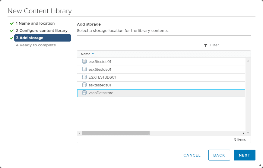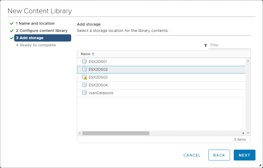 Next, you have to configure where the items hosted by the Content Library will be stored. Select the datastore you want to host the Content Library.
