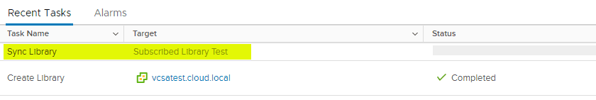 A new vCenter Server task will kick off on the target vCenter Server called Sync Library which means it is synchronizing the items, either full files or metadata, depending on the options chosen.
