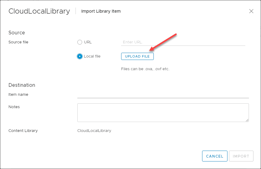 This opens the Import Library Item screen. You have the options of URL or Local file. I am wanting to publish an ISO file that is stored on my workstation. Here, select Local file and Upload File. This will open the normal Windows Explorer browse dialog box to allow you to select the file to upload.