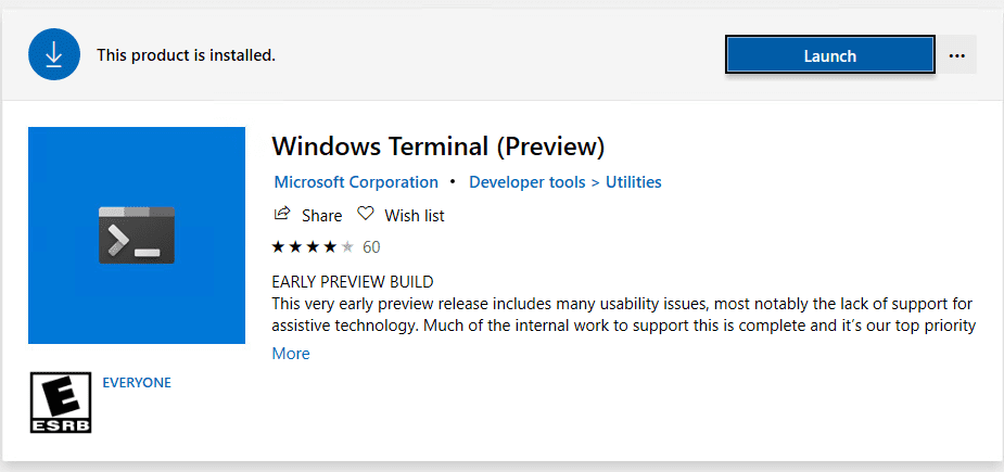 After installing, the new Windows Terminal Preview is ready to Launch. As you can see, you can do this right from the Windows Store.