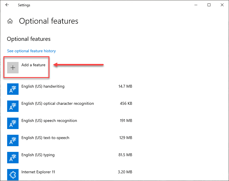 Once you click the Optional features link, click the Add a feature button.