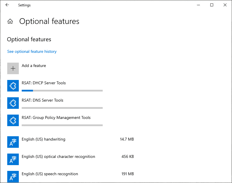 If you go back to the Optional features page just one level back, you will see the progress of the RSAT installations.