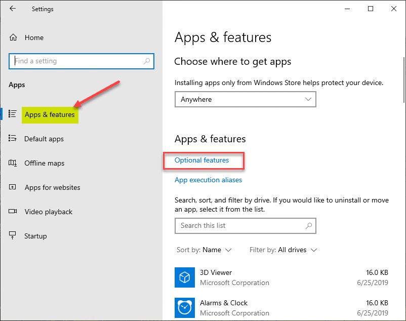 This will take you to the Apps & features page. Click the Apps & features link on the left side of the page, then click the Optional features link.