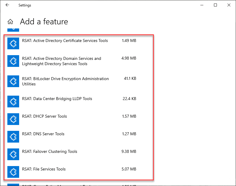 This will launch the Add a feature page. Scroll down until you see the list of available RSAT tools available for download and install. There are several to choose from. ***Note*** the screenshot below does not include all the available RSAT tools.