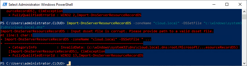 There is a cmdlet that references “Import” functionality called the Import-DnsSkerverResourceRecordDS that I thought might possibly work with the exported file. However, when pointing to the exported file, the cmdlet didn’t like the backup file. This is not the purpose of this cmdlet, but I thought I would give it a shot anyway. No go.