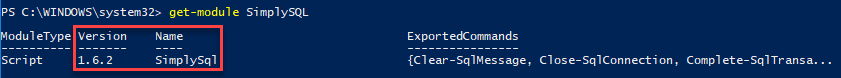 After installing the module, I ran a quick Get-Module command to get a quick status on the SimplySQL module: