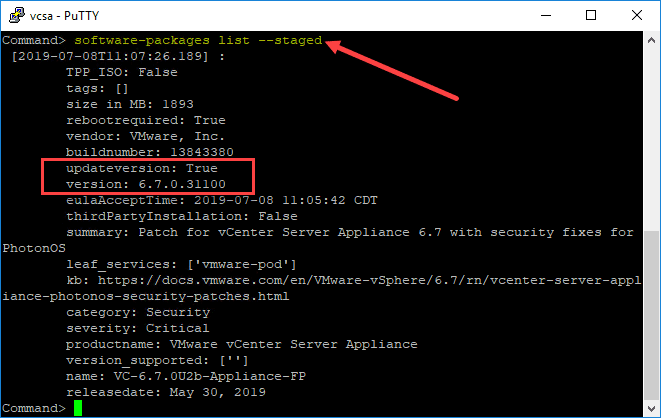 You can list out the staged VCSA appliance patch as well as the updateVersion in the staged ISO patch by running the following command: