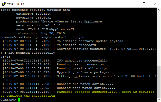 After a few minutes, you should see the message, “Packages upgraded successfully, Reboot is required to complete the installation“.