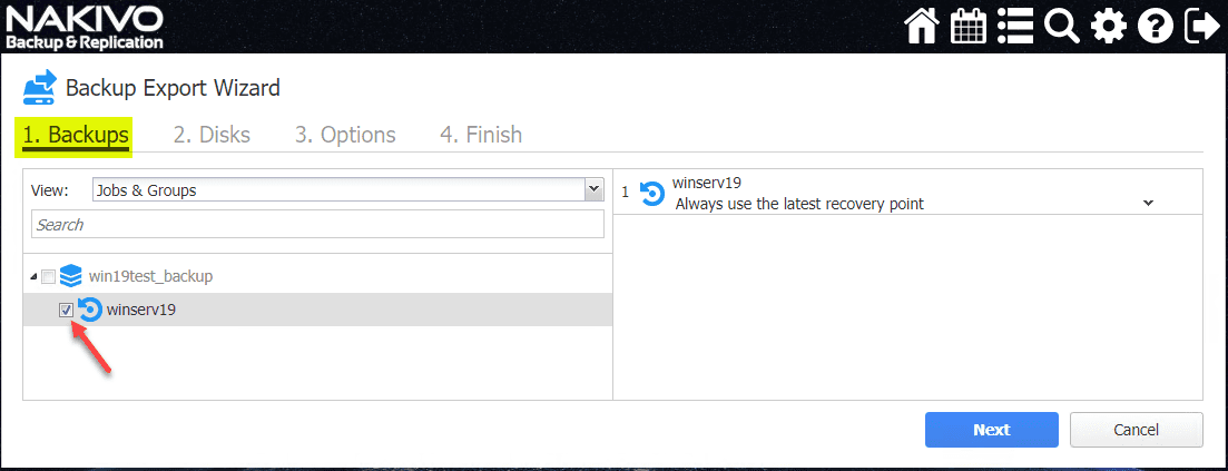 The Backup Export Wizard process begins. The first step is choosing the Backups to export. You will see the physical server backups you have listed to choose from.