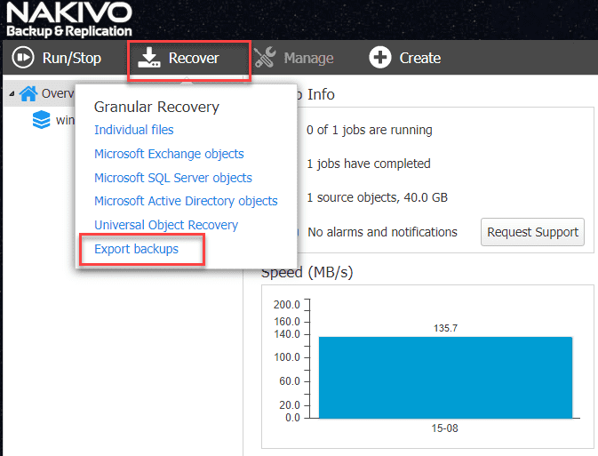 The export process of the physical disk is found under the Recover menu of the NAKIVO interface. Select Recover > Export Backups.