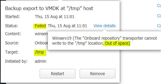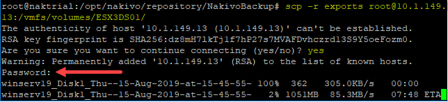 I didn’t wan’t to have to double hop this to a workstation and then to the ESXi host. So, I simply scp’ed it from the NAKIVO appliance to the ESXi host directly. You can use the command:
