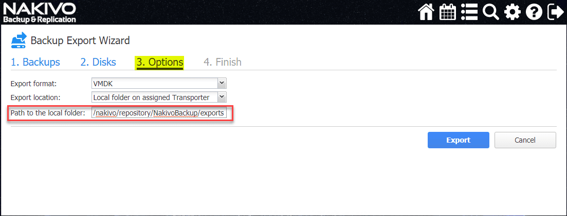 Choose the export folder you want to use. Since I am using the NAKIVO appliance, I am going to just export the files to a local folder on assigned Transporter.