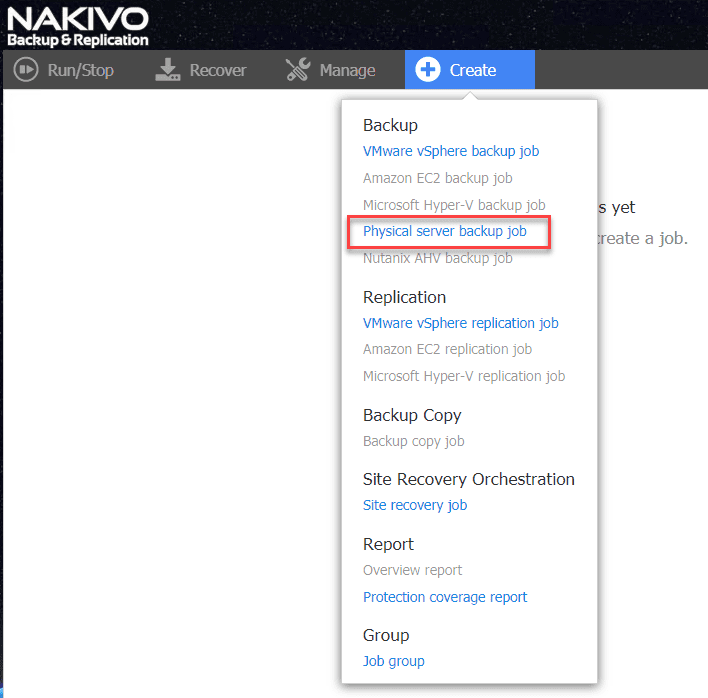 To perform the P2V operation, we need to get a good backup of the physical server. The backup of the physical server using NAKIVO captures a backup of the hard disk of the physical server. To P2V the server, you then restore the disk as a virtual disk export as we will see later. First, let’s create and run the backup job of the physical server. Navigate to Create > Physical server backup job.