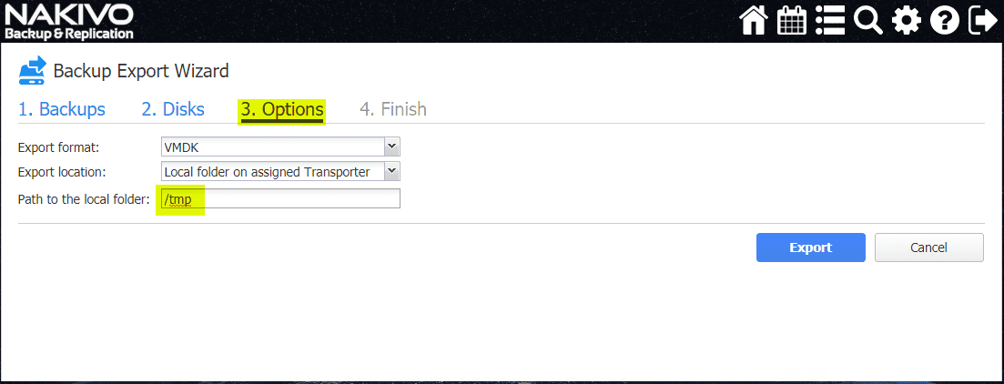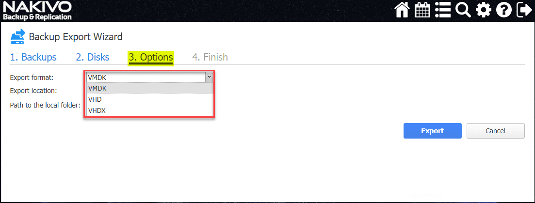 NAKIVO allows exporting in the format of VMDK, VHD, and VHDX.