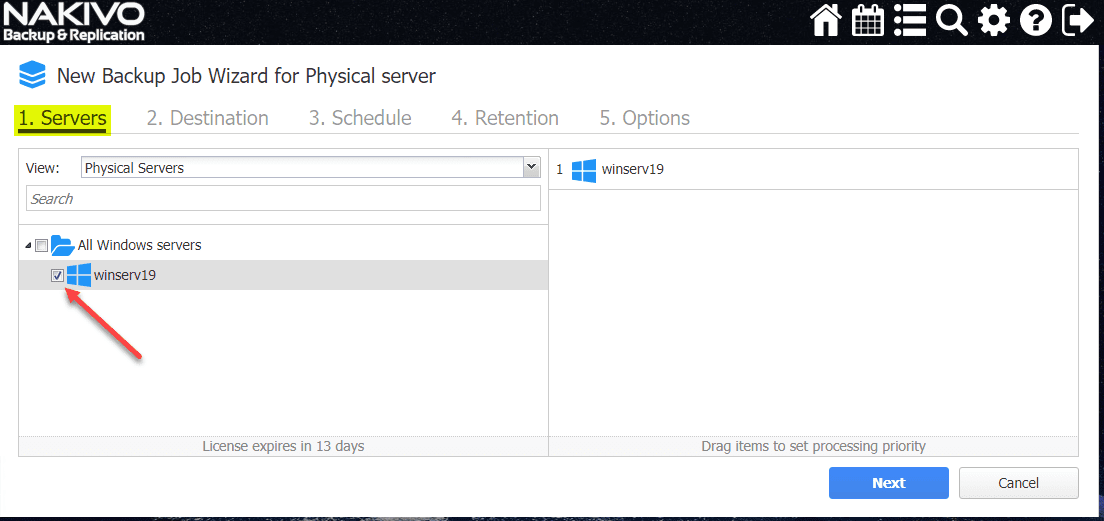 Now that the physical Windows Server is in NAKIVO inventory, we can create a Physical server backup job.