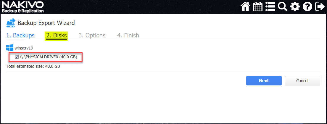 Select the Disks that you want to export. If you have multiple disks on a physical server, you can choose to only export a subset of those disks if you want.
