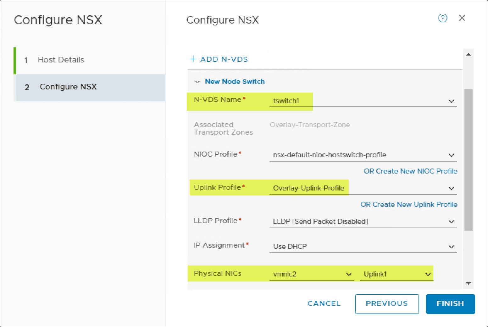 The next, Configure NSX screen has you create/choose the Transport Zone, N-VDS name, Uplink Profile, and physical NICs to associate with the uplinks of the Uplink profile.