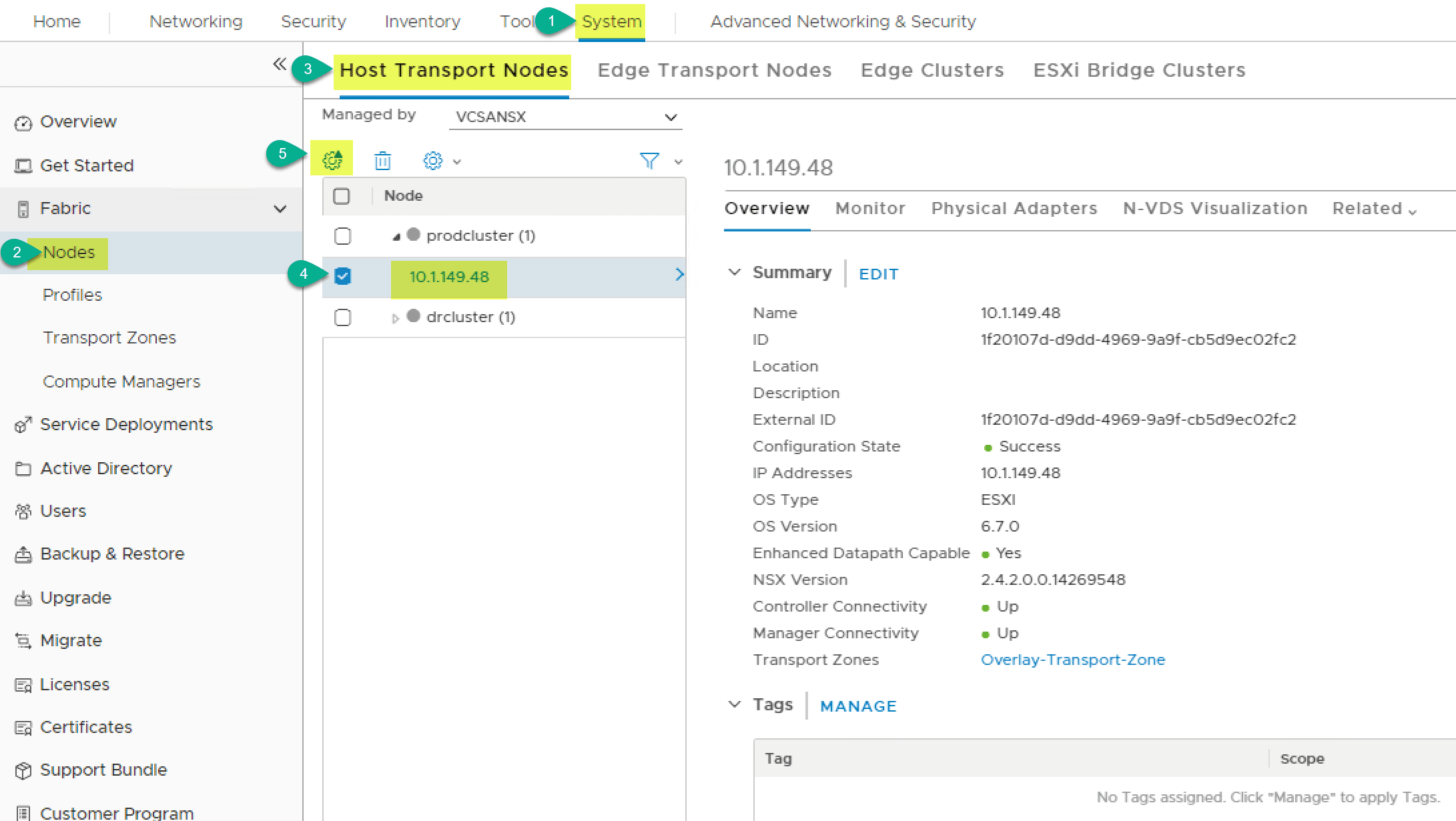To manage your physical NSX-T network adapters navigate in the NSX-T manager to System > Fabric > Nodes > Host Transport Nodes > click host > click Edit to bring up the NSX configuration on the transport node.