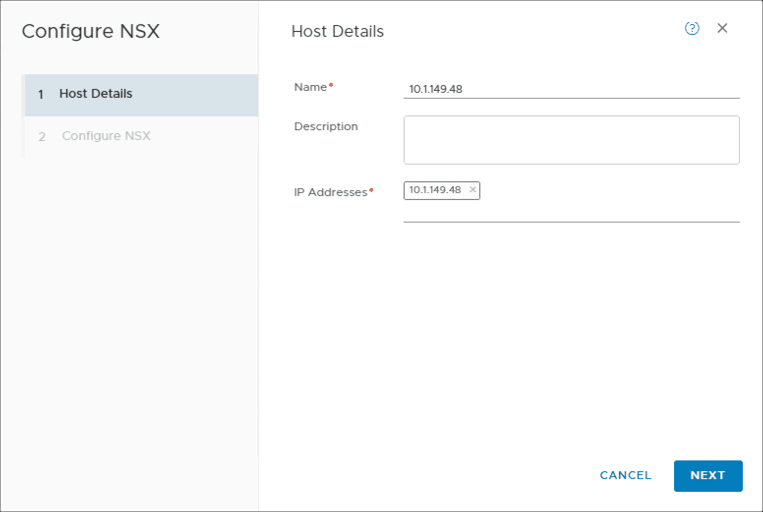 The two-step Configure NSX wizard launches. The first screen of the wizard is to verify the host details.