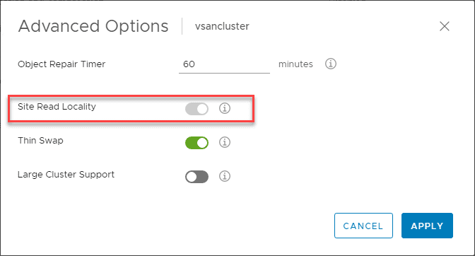 To find the Site Read Locality setting, navigate to the vSAN cluster Configure > vSAN > Services > (Advanced Options) Edit.