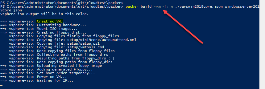Let’s put it altogether and see what the build of Windows Server 2019 Core looks like using Packer. Here, we simply call the files that we have built above: