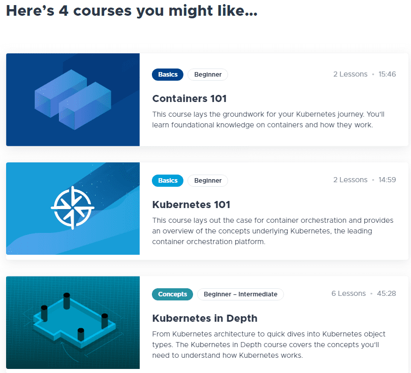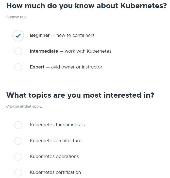 After submitting your knowledge assessment of your Kubernetes knowledge, the VMware Kubernetes Academy will recommend courses that are more tailored to your knowledge level.