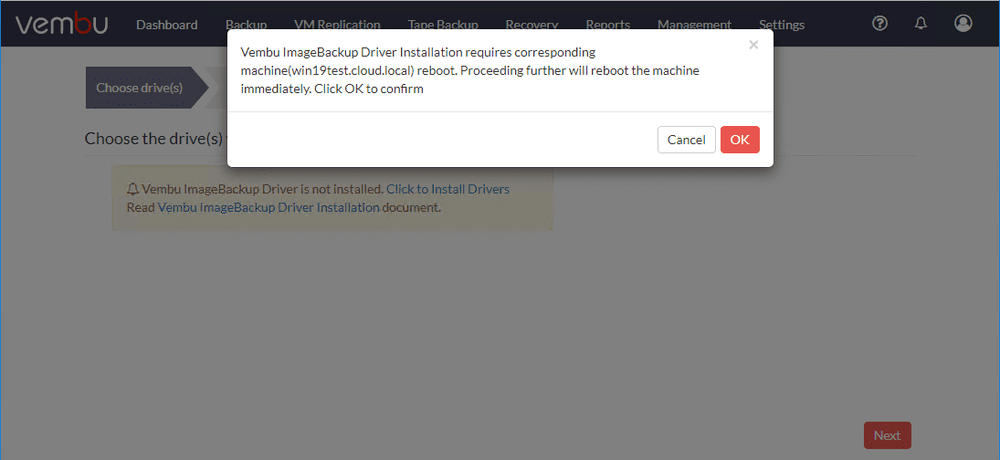 Vembu requires that its Vembu ImageBackup Driver is installed on your Windows Server host. Simply click the Install Drivers to initiate the driver install.