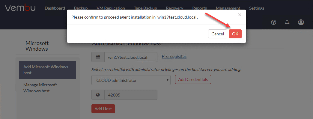 Next, you are asked to populate the name of the Windows Server for Vembu to make its connection as well as connection credentials. If you don’t already have the credentials populated, you can click Add Credentials to do that.